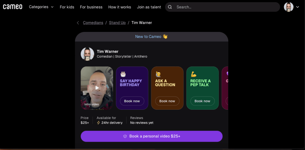 Whether it’s a milestone birthday, an anniversary, or a long-awaited reunion, make it unforgettable with a one-of-a-kind Cameo video from Tim Warner. You’ll have the chance to customize your request for Tim Warner, like asking them to mention inside jokes, share words of wisdom, or work in their signature catchphrases. Don’t be afraid to get creative with your request, especially for celebrations like weddings, retirements, or bachelor and bachelorette parties that call for a good laugh. No matter the occasion, the video will be yours to keep – share the fun and relive the moment for years to come.